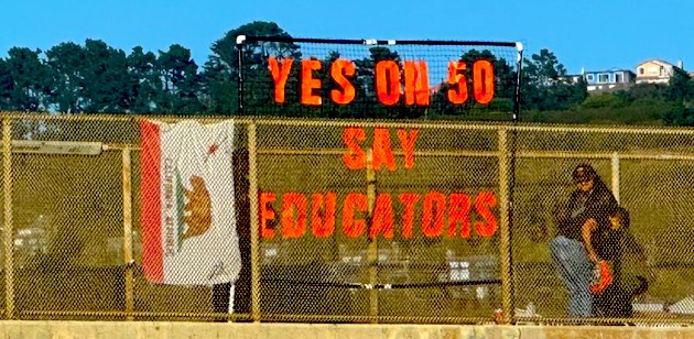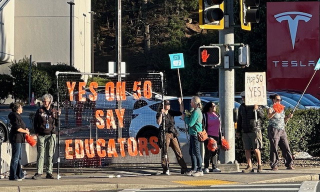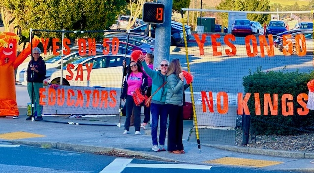 Freeway bannering from CA educators showing love for the CA flag (eureka!), Yes on Prop50 & No Kings, at crossroads, over freeways, and in front of Tesla!