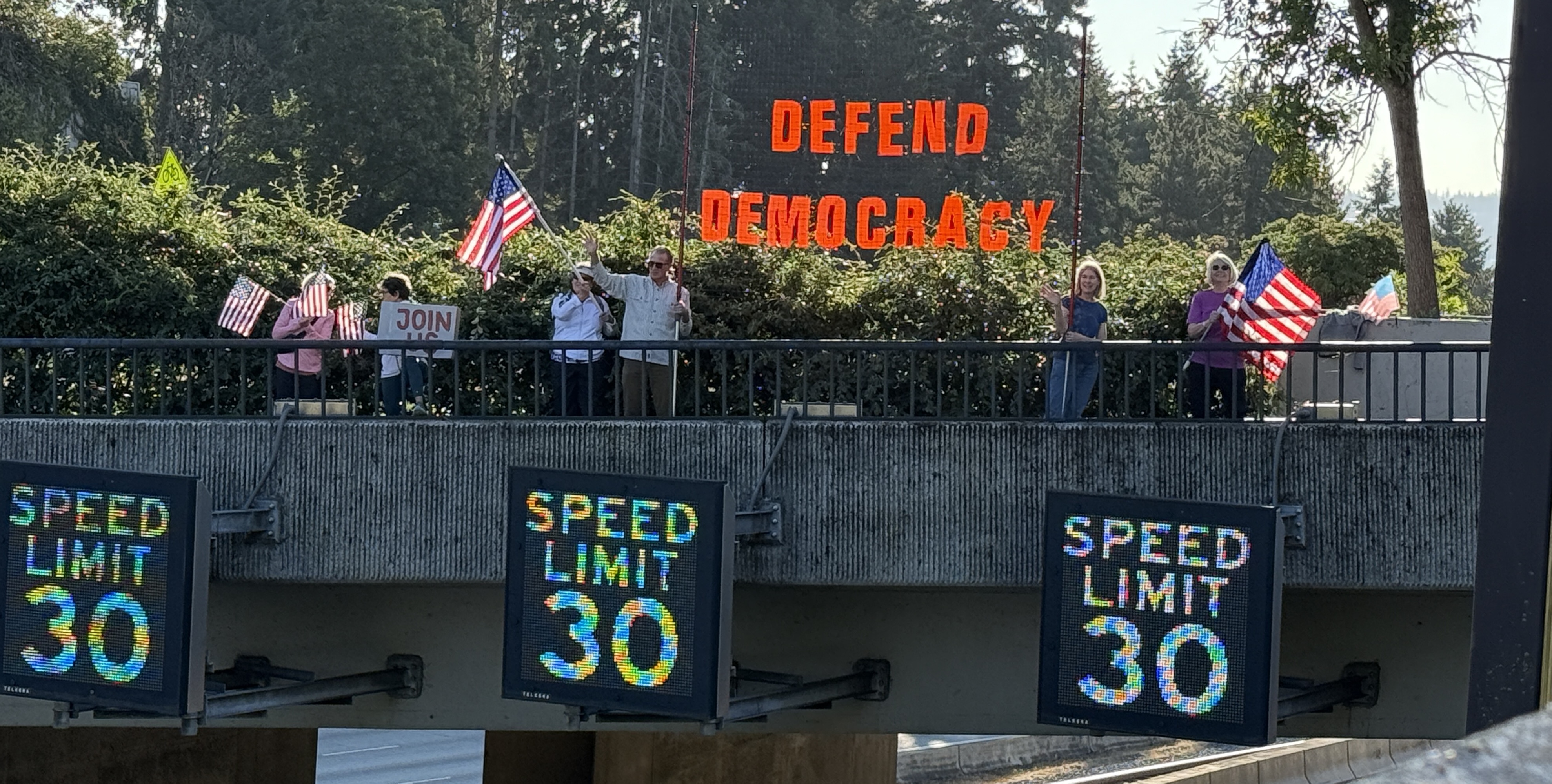 Mercer Island I-90 overpass bannering by people over 30 (speed limit signs;>).