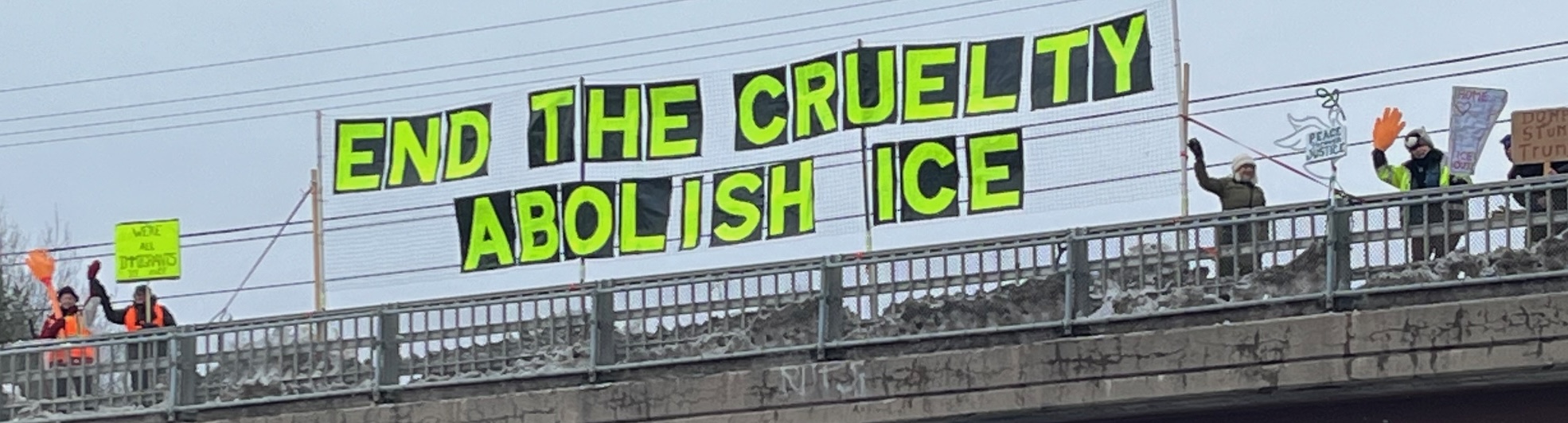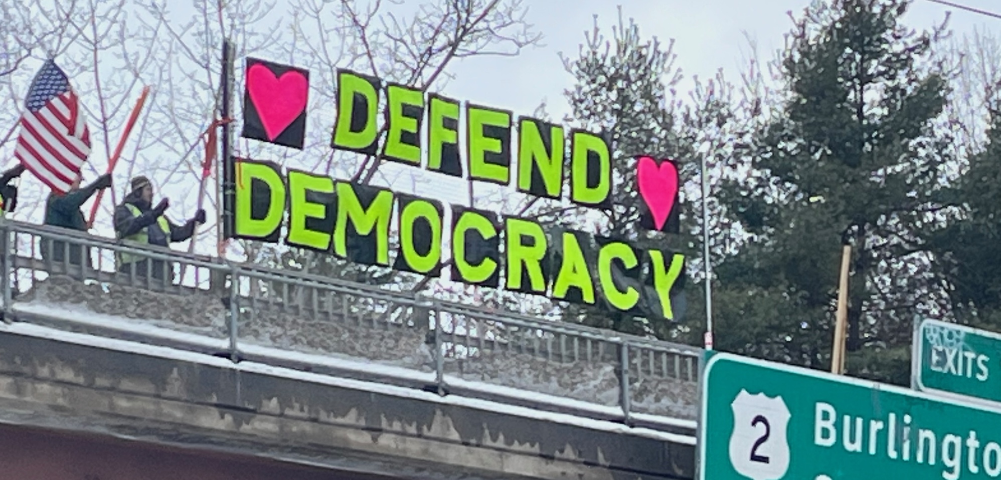 South Burlington Vermont Patchen Road overpass over I89. Champlain Valley Indivisible spent 1/2 hour clearing enough snow off the sidewalk, to banner ~3,600 cars / hour. Valentine hearts on display, freezing cold, piles of snow, and warm hearts:>!