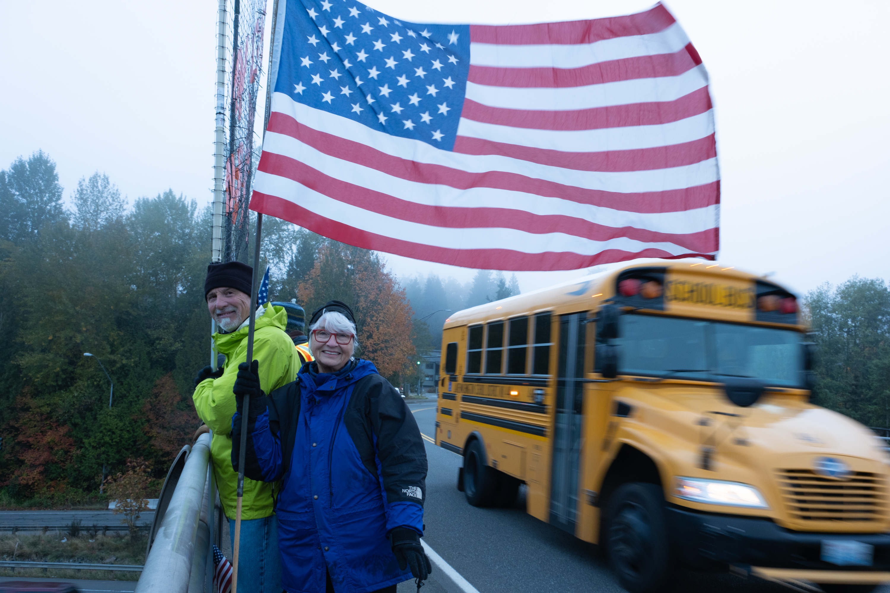 Showing US Flage with US yellow school bus on overpass, and No Kings - Vote Nov 04 in reversed image for legibility from camera angle.