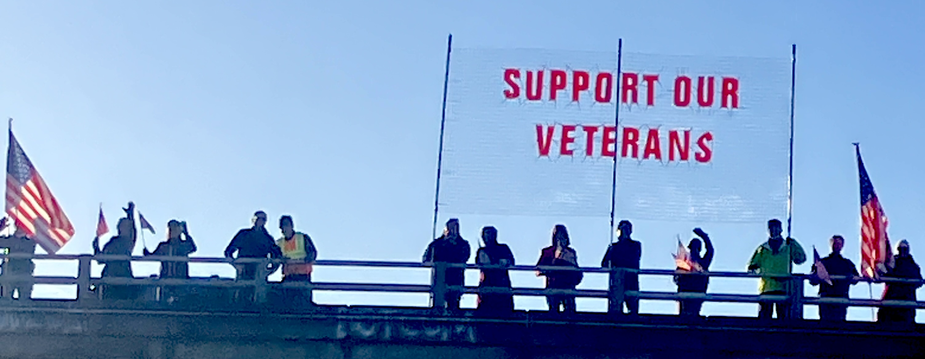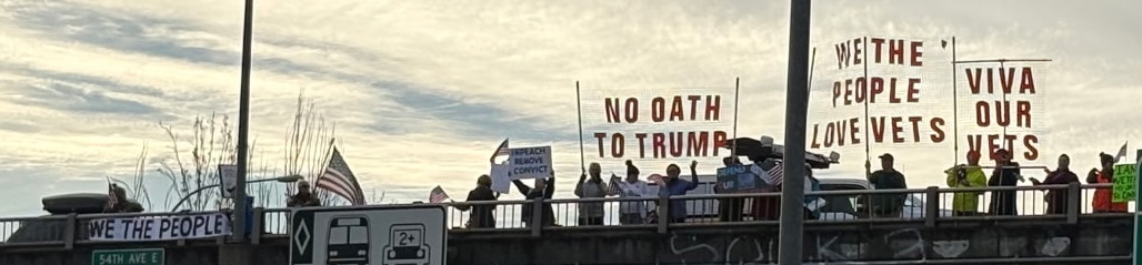 Veteran's Oath is to The People NOT POTUS, Support Our Veterans, No Oath to Trump, We The People Love Vets, & Viva Our Vets overpass bannering, with US flags.