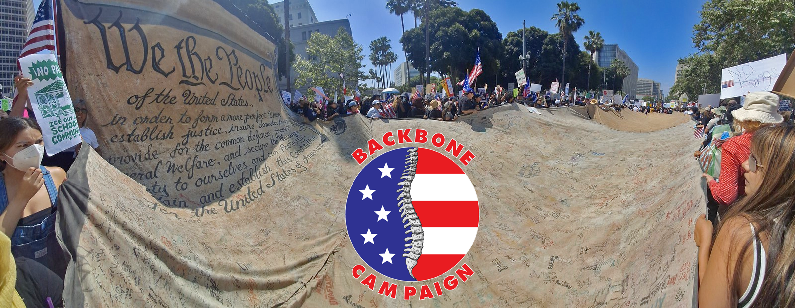 Backbone now has THREE iconic We the People Constitution preambles and over 300 feet of extensions for people to sign and deploy in marches. This Backbone prop, above all others, has captured the spirit of our resistance to fascism and oligarchy. As the photos show, it is constantly showing up in press coverage of our growing movement. That's why we have assembled three teams to bring these powerful props to DC, Chicago and Seattle for the upcoming No Kings mobilization.