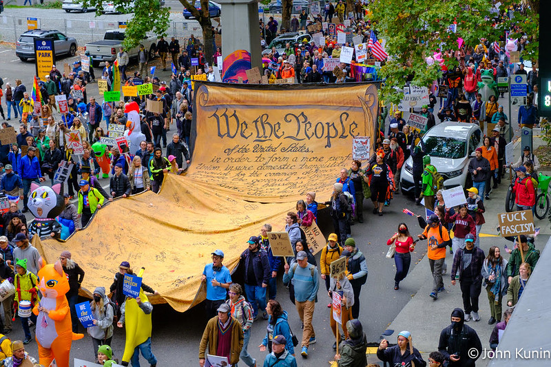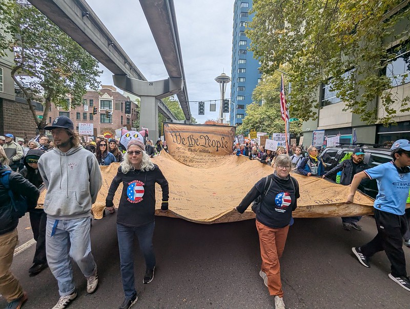 The Seattle No Kings rally and march began at the Seattle Center in the shadow of our famed Space Needle.