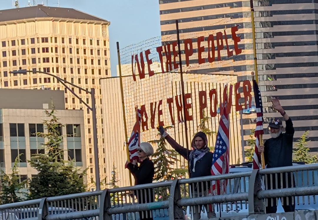 I-5 overpass bannering, with distress US Flags, and the Seattle Henry M. Jackson Federal Immigration Court Building in the leftmost background.