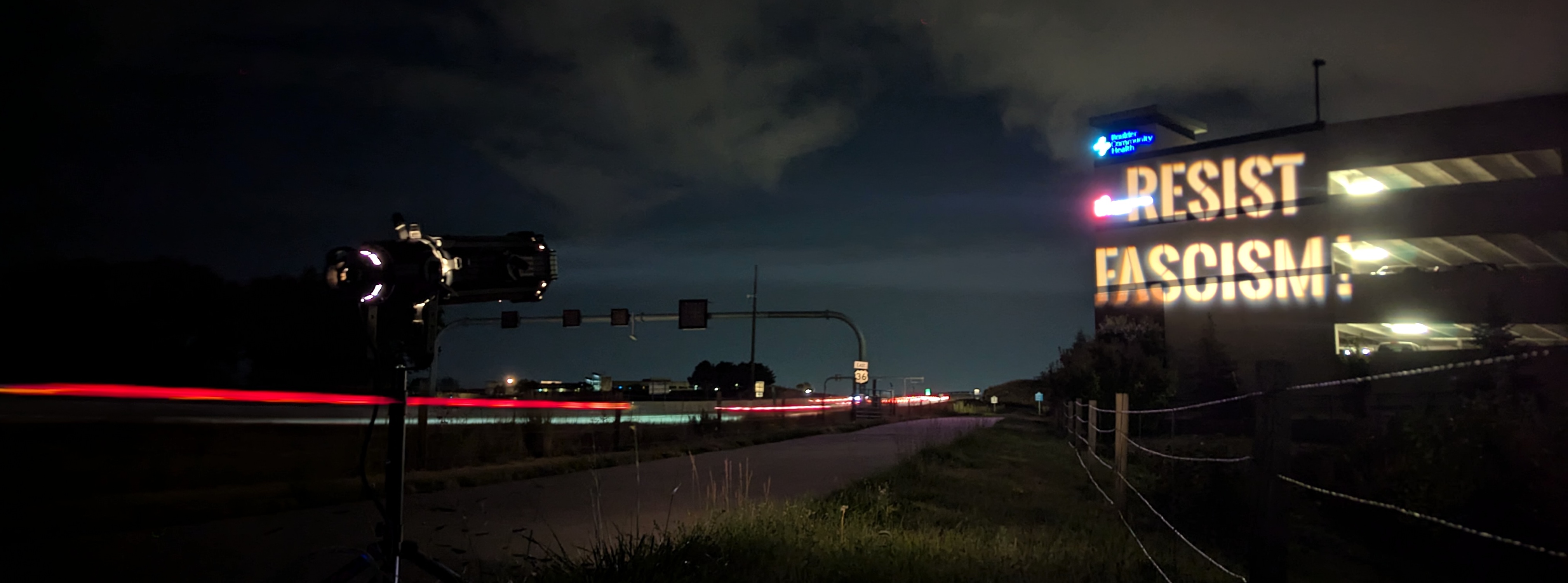 Used 2 batteries for ~1hr. of projection, ~ 3 cars / sec, so ~8-10k cars viewed the projection. Will need a cart / wagon for multiple batteries - too heavy for a single backpack. Also brought a small DOT fire extinguisher in case of any problem with dry vegetation.