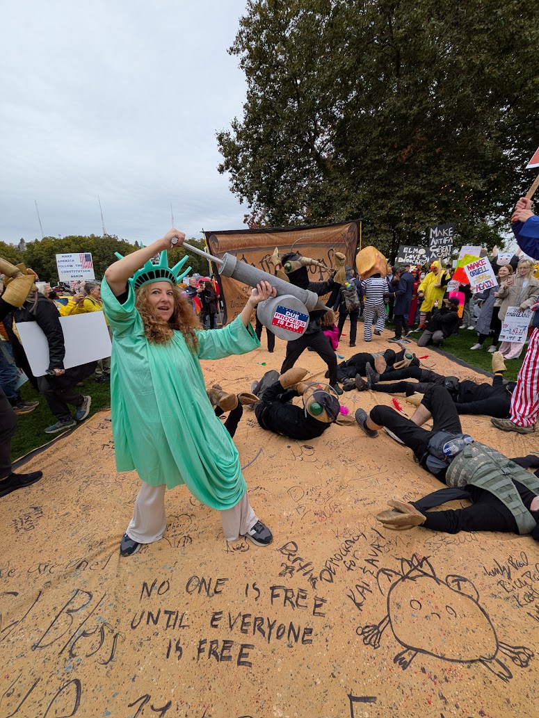 We the People are not the Enemy. That has been one of Backbone’s core messages since Trump sent troops into LA this Spring. Using light projection, our iconic We The People props, and our giant overpass banners, we’ve appeared - in visually LOUD ways - across the country! One particular effort we’re especially proud of this year is No Kings Day on October 18th.