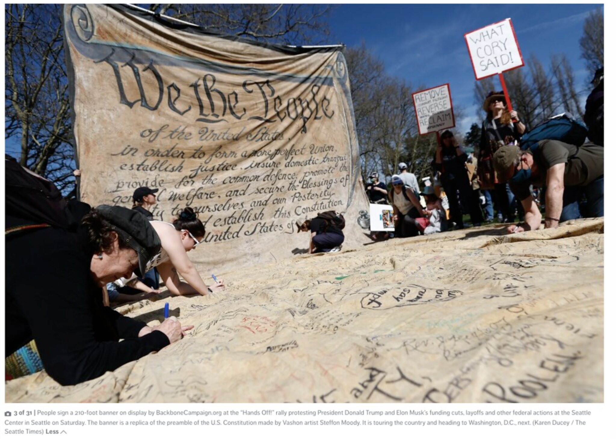 Since January 20th, the Backbone Campaign has trained hundreds of volunteers across the country and supplied dozens of banner toolkits to communities near and far. Now we’re hitting the road with our giant 210' “We the People” constitution replica and heading to Washington, DC. We’ll be joining the May Day protests standing up for worker and immigrant rights.