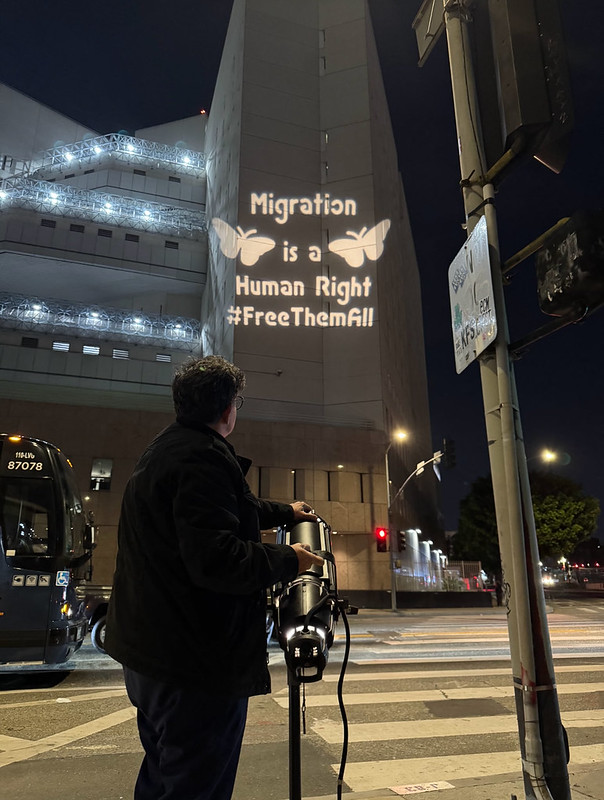 mark! Lopez of East Yard Communities for Environmental Justice shared this incredible story. “The migrants detained were flashing their lights and waving letting us know they could see us. A truck with a big white container stopped at the light to our right so we were able to project right on to the truck for all of them to see.”