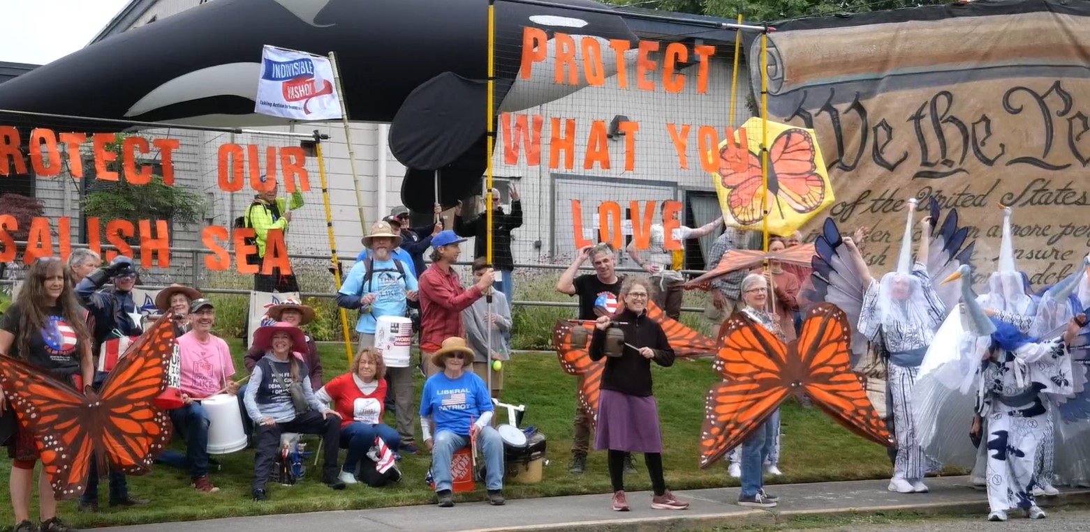 Last month, a large contingent of props and supporters marched in our local Strawberry Festival, with giant orca, salmon, the We the People, butterflies and more!