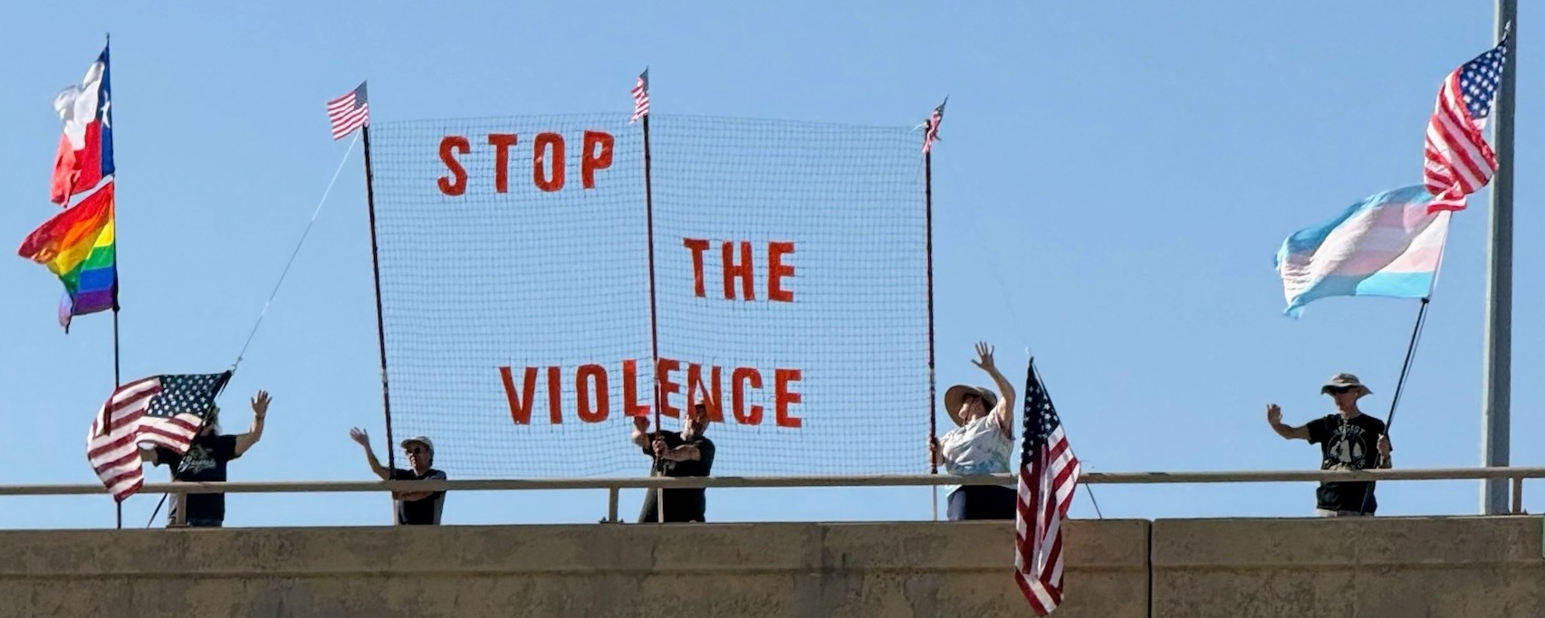 Stop The Violence overpass banner from Richardson, TX, with TX, Pride,US, and Gender Diverse flags.