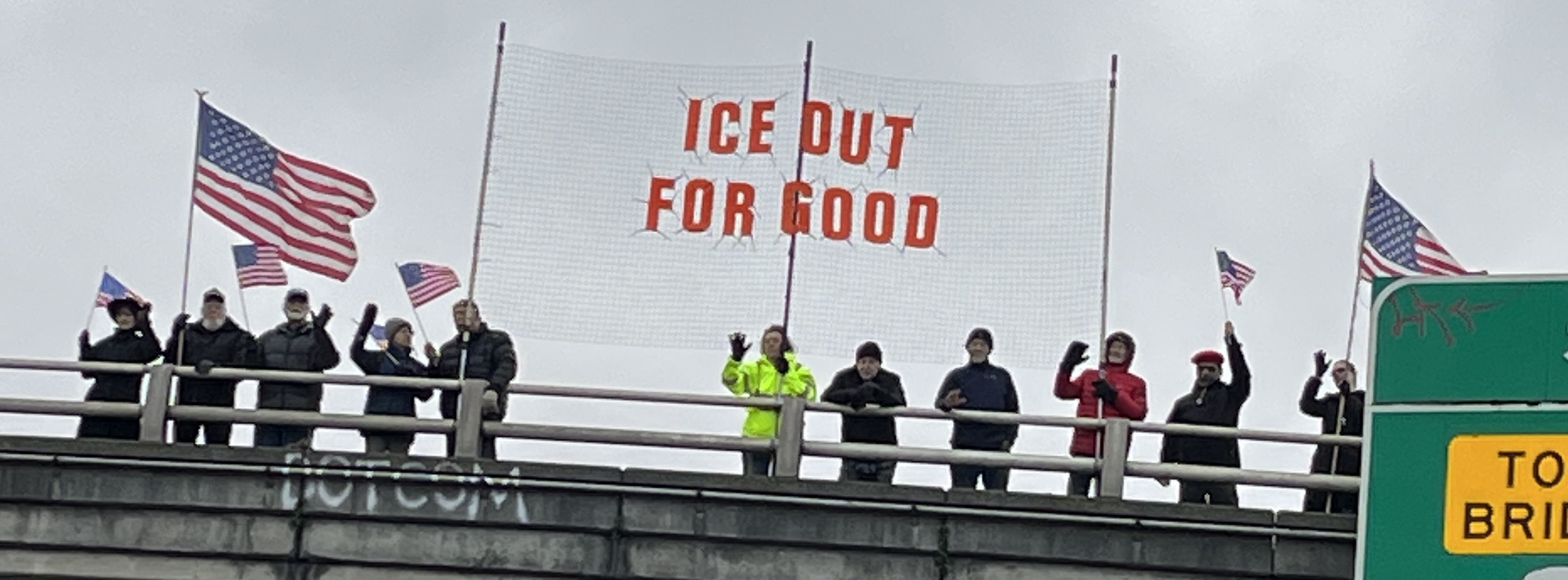 Ice Out For Good bannering with US flags, honoring Renee Nicole Good.